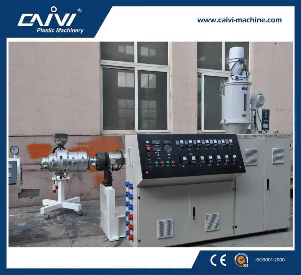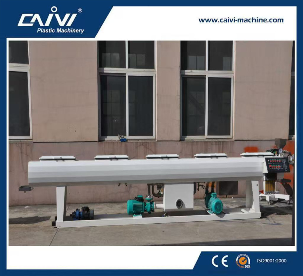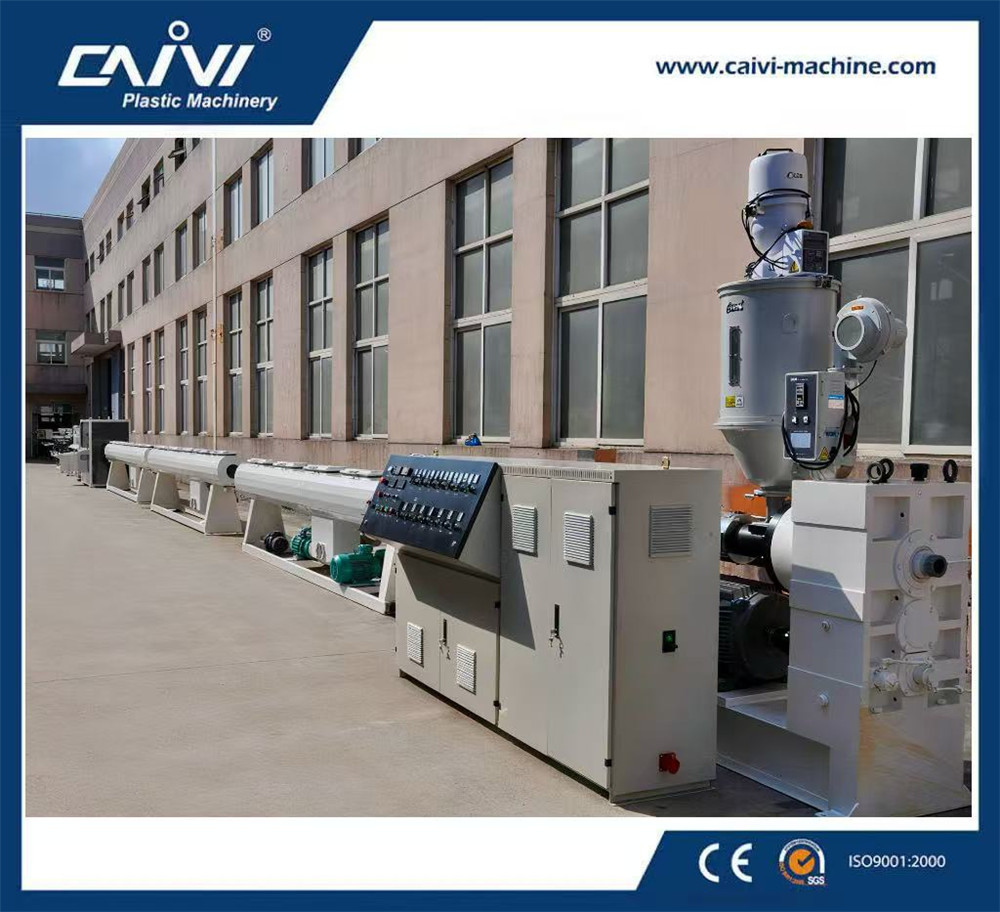原料+色母料→混合→真空上料→材料干燥→單螺桿擠出機→四色線擠出機→籃式模具→定徑套→噴淋真空定型箱→噴淋真空定型箱→噴淋冷卻水箱→噴淋冷卻水箱→色帶印字機→履帶式牽引機→行星切割機→管材堆放架→成品檢測包裝